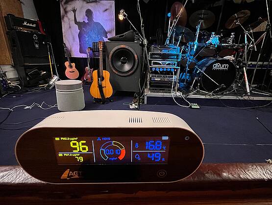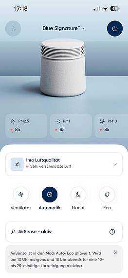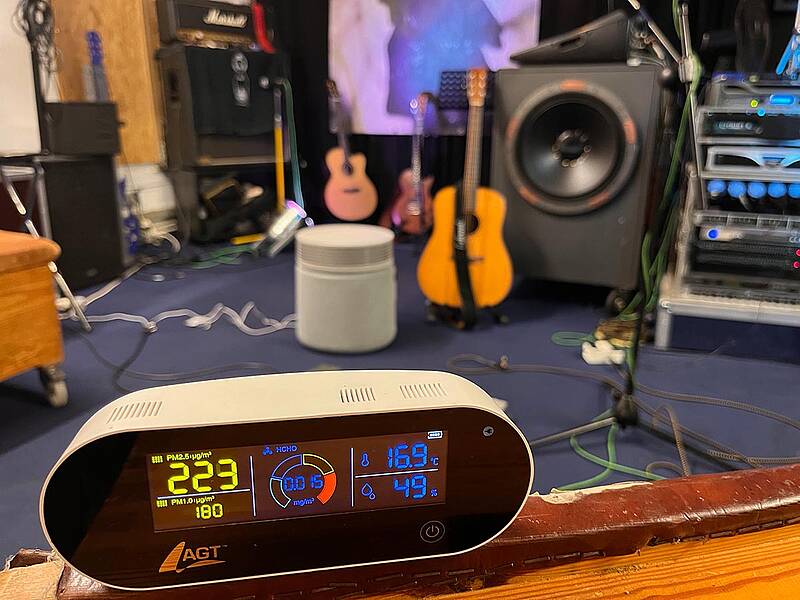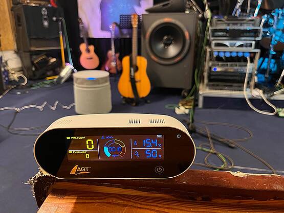 Der Luftreiniger Blue Signature SP4i kommt „startbereit“ aus dem Karton und ist sofort einsatzbereit, es muss Nichts zusammengebaut oder angeschraubt werden, lediglich die Stromversorgung mittels beigelegtem Steckernetzteil muss hergestellt werden. Eine kurze Berührung des Sensorfeld - und schon startet das Gerät mit der Luftreinigung. Unser Redaktionsbüro in unmittelbarer Nähe zu einem Wald hat zum Glück eine hervorragende Luftqualität, so dass der Blue Signature „nur“ auf Stufe 1 läuft und per blauem Licht die saubere Luft bestätigt. Dabei fällt uns das sehr leise Betriebsgeräusch (gemessen: 25 dBA) des Lüfters und die geringe Leistungsaufnahme von 4 Watt sehr positiv auf – auf dieser Stufe ist der Dauerbetrieb in einem Wohn- oder gar Schlafraum kein Problem. Wir verlagern daher unser Testumfeld ganz pragmatisch in einen Musik-Proberaum einer befreundeten Rockband. In diesem etwa 70qm großen Raum wird wöchentlich geprobt, aber selten gelüftet. Auch sammeln sich dort Staub, Gerüche und Zigarettenqualm aus den letzten Jahrzehnten – ideale Bedingungen für den Test unseres Hochleistungs-Luftreiniger. Dabei verlassen wir uns nicht nur auf die Anzeige des Verschmutzungsgrad der Raumluft am Gerät und in der App, wir platzieren zusätzlich ein kleines Messgerät für die Feinstaubwerte und Formaldehyd-Ausdünstungen (HCHO), die leider in vielen Werkstoffen und Materialen wie Spanplatten, Kunststoffen, Lacken und Klebern vorkommen. Das Ergebnis unserer Start-Messung ist erschreckend: Die Feinstaubbelastung durch PM2,5 und PM1 Partikel liegt bei über 200 Mikrogramm pro Kubikmeter Luft. Der gemessene HCHO-Wert liegt mit 0,015 mg zwar unter dem ab August 2026 geltenden Grenzwert von 0,062mg, sollte aber dennoch idealerweise verringert werden.