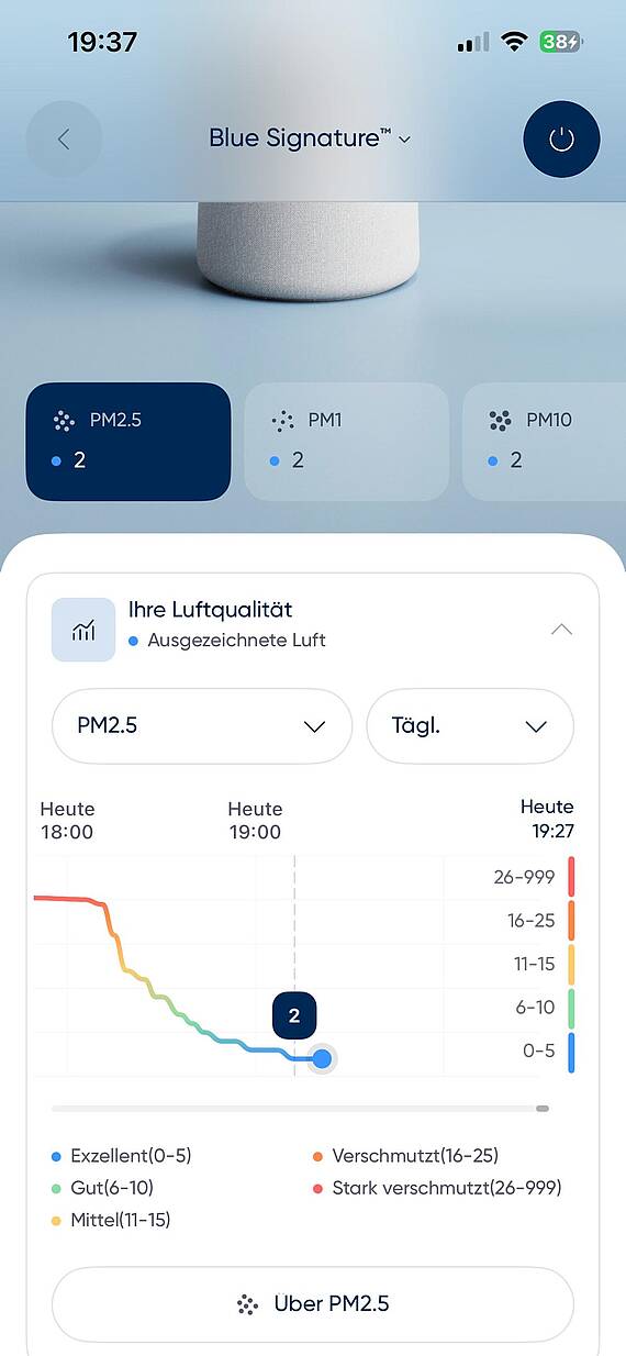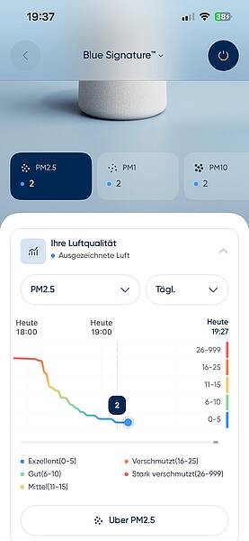 Der Blue Signature quittiert diesen Zustand mit einem roten Leuchtstreifen und startet dank Auto-Modus sofort auf maximaler Leistungsstufe. Hierbei produziert er neben einem spürbar starken Luftstrom auch deutlich mehr Betriebsgeräusch (ca. 55 dBA). Theoretisch sollte der Blueair in dieser Einstellung unseren Testraum 4-mal innder Stunde komplett „durchfiltern“. Wir belassen das Gerät im Auto-Modus und schauen uns den Verlauf der in der App aufgezeichneten Messkurve an. Hier zeigt sich eindeutig die effektive Reinigungswirkung des Blue Signature SP4i, denn schon nach einer guten Stunde haben sich alle Werte mehr als halbiert. Wir lassen das Gerät über Nacht weiter im Auto-Modus laufen und checken am nächsten Vormittag das Endergebnis. In nur wenigen Stunden hat der Blue Signature alle Feinstaubpartikel aus der vorher stark kontaminierten Raumluft entfernt. Unser Messgerät zeigt 0 Mikrogramm für PM2,5 und PM1 an, der SP4i leuchtet nun blau und hat auf die kleinste Lüfterstufe zurückgeschaltet. Auch der HCHO-Wert ist nochmals um 30% gesunken und ist absolut unbedenklich.