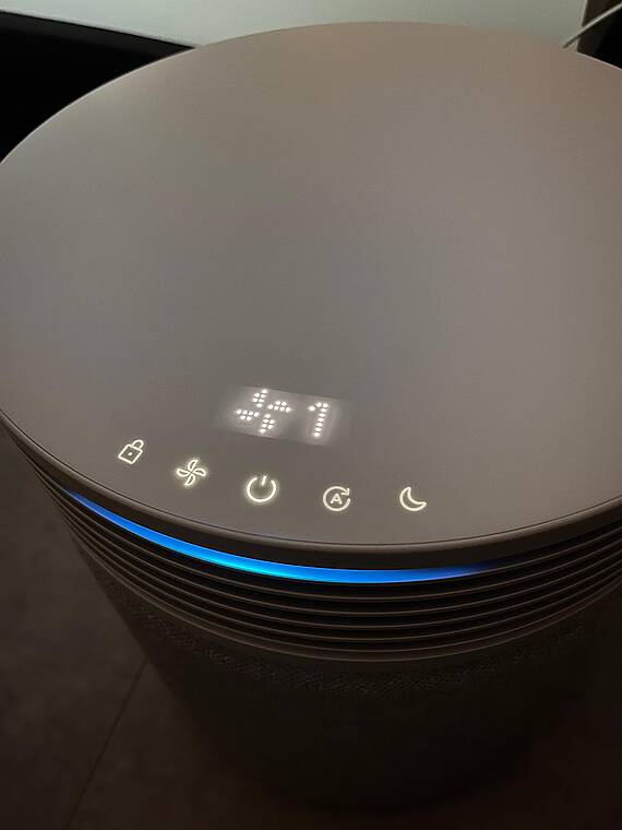 Nebenbei werden auf einem kleinen Display oberhalb der Tastenfelder die aktuelle Werte für PM10, PM2.5 und PM1 Belastung angezeigt. Zusätzlich zeigt ein Lichtstreifen in den Lüftungsschlitzen durch unterschiedliche Farben die gerade vorhandene Luftqualität an: Rotes Licht warnt vor starker Verschmutzung und blaues Licht gibt bei sauberer Luft eine Entwarnung.