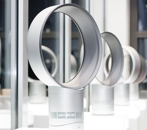 Der Dyson Air Multiplier erzeugt wie jeder Ventilator einen kühlenden Luftstrom, nur tut er das, ohne Luft durch Verquirlen zu beschleunigen. Sein Luftstrahl ist konstant gleichstark, weil der Air Multiplier über seinen Fuß Luft ansaugt und dann innerhalb eines Reifs verstärkt und zielgerichtet auspustet. Weil es keine Rotorblätter besitzt, lässt sich das Gerät leichter reinigen und ist weitaus sicherer als Ventilatoren, deren Rotorblätter nur durch Gitter geschützt sind. Über seinen Reif lässt sich der Luftstrahl leicht ausrichten und zielgerichtet einsetzen. Ähnlich wie bei einem Düsentriebwerk, saugt ein bürstenloser Motor die Luft über den Fuß des Dyson Air Multipliers an und verdichtet diese über einen 1,3 Millimeter schmalen Spalt. Eine Schräge sorgt dafür, dass sämtliche Luft zusammengeführt und der Luftstrom kanalisiert wird. Dabei wird die den Reif umgebende Luft eingesogen und verstärkt den Luftstrahl zusätzlich.
