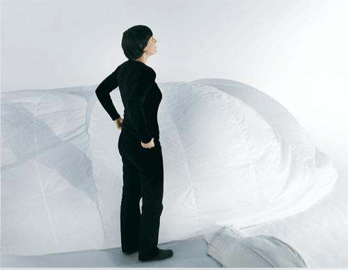 Wer in aller Frühe im Hotel aufwacht, von dort aus von einem Termin zum nächsten hastet, hat kaum eine Minute für sich allein. In Monica Försters Vorstellung suchen sich gehetzte Geschäftsleute in dieser Situation einfach ein ruhigeres Plätzchen in der Messehalle oder im Großraumbüro, öffnen die schmale weiße Tasche, ziehen das helle Zelttuch hervor und pusten per elektrischem Gebläse Cloud auf. Die schwedische Designerin bezeichnet ihr Zelt mit einer Grundfläche von vier Metern mal 5,30 Metern als aufblasbares Büro. Schon der Anblick von Cloud beruhigt gestresste Managerseelen. Die große Wolke scheint jeden Moment vom Boden abzuheben. Der Kokon verspricht Ruhe - egal, ob man seine Unterlagen für eine Besprechung durchgehen, ein Powernapping, wie das Schlafen in der Geschäftswelt genannt wird, machen oder einfach den Anblick der weißen Zeltwände genießen möchte. Der helle Stoff von Cloud lässt genügend Tageslicht ein. Da das Zelt über kein Gestell verfügt, bleibt das Gebläse die ganze Zeit über eingeschaltet, es sollte also eine Steckdose in der Nähe sein. Mag der Anblick des Nylontraums in Konferenzzimmern und Bürofluren etwas surrealistisch anmuten, zumindest die neidischen Blicke der Kollegen muss man nicht ertragen, wenn man sich in Cloud verkriecht.