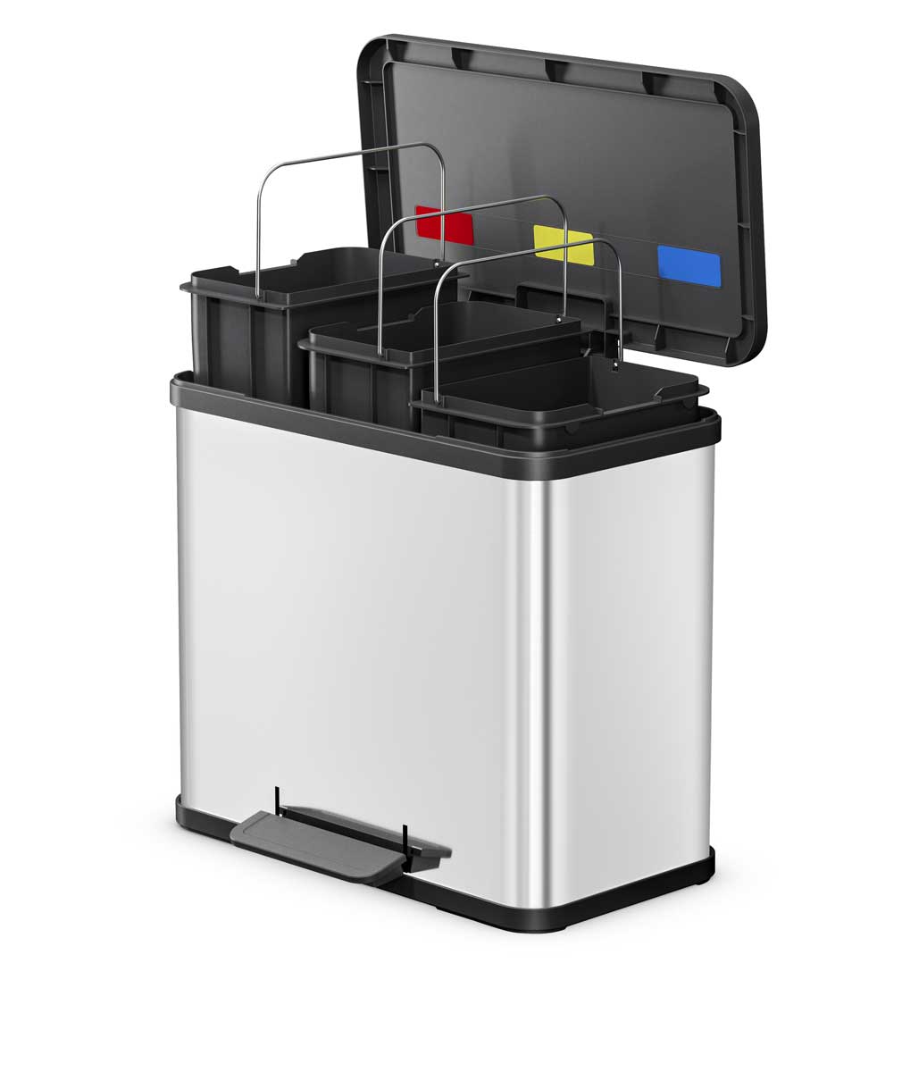 Für alle, die eine freistehende Alternative suchen, ist der HAILO Öko Trio Plus L eine gute Wahl. Drei separate, leicht entnehmbare Inneneimer sorgen dafür, dass Restmüll, Verpackungen und Biomüll hygienisch getrennt gesammelt werden können. Dank der großen Einwurföffnung und des praktischen Deckels, der sich bequem mittels eines Fußpedals öffnen lässt, bleibt die Nutzung komfortabel, während das schlichte Design in jede Küche passt.