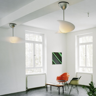 Zart sieht er aus, der Deckenventilator von Serien Lighting. Wie ein Flügel dreht er sich und dient gleichzeitig als Leuchtkörper, denn Designer Yaacov Kaufman hat den kompletten Rotor als Lampenschirm konstruiert. Er besteht aus einem elastischen Stoffüberzug, darunter liegt ein Gerüst aus Federdrahtstahl. Konstruktion und Oberfläche sorgen für einen gleichmäßigen, kühlenden Luftstrom. Innenliegend ist genügend Platz für eine 150-Watt-Glühlampe. Durch den Stoff schimmert das Licht besonders sanft und erhellt Räume gleichmäßig. Drehzahl und Lampe sind über die Fernbedienung regelbar. Am Rotor selbst lässt sich auf Rückwärtsbetrieb für Luftzirkulation im Winter umschalten. Fürs Reinigen ist der Stoffbezug abnehmbar. Der Design-Deckenventilator ist neben seiner nützlichen Funktion gegen Hitze im Sommer das ganze Jahr über eine ungewöhnliche Lampe und ein Blickpunkt im Raum.