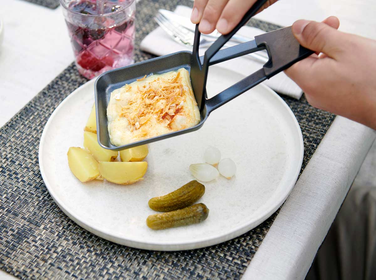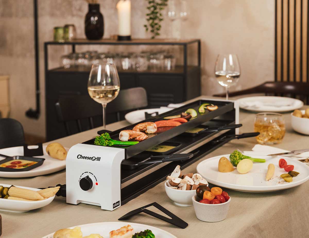 Raclettekäse gibt es das ganze Jahr über. Und sollte der Lieblingskäse aus Frankreich oder der Schweiz einmal vergriffen sein, eignet sich auch jeder andere Halb- oder Vollfettkäse für Raclette. Als Faustregel gilt: Je höher der Fettgehalt, desto niedriger ist der Käseschmelzpunkt. Neben der großen Käsevielfalt sind auch bei der Auswahl der Zutaten fast keine Grenzen gesetzt. Je nach Geschmack und Vorliebe lässt sich der Käse mit den unterschiedlichsten Lebensmitteln verfeinern: klassisch mit Knoblauch, Zwiebelringen, Speckwürfeln oder Pilzscheiben oder Black Pilzscheiben oder kreativ mit exotischen Gewürzen, Früchten, Obst, Sauerkraut oder sogar Sushi. Einfach die gewünschten Zutaten zusammen mit der Raclettescheibe in das antihaftbeschichtete Pfännchen geben und warten. Durch die optimale Wärmeverteilung ist der Käse innerhalb weniger Minuten geschmolzen und kann dann serviert werden. Zusätzlich lassen sich auf der Wende-Grillplatte kleine Gemüse-, Fisch- oder Fleischstückchen grillieren. Dank der stufenlosen Temperaturregelung ist die Hitze optimal einstellbar, so dass nichts anbrennt. Und wer beim Essen einmal eine Pause einlegen möchte, kann sein Pfännchen im Parkdeck bequem abstellen.