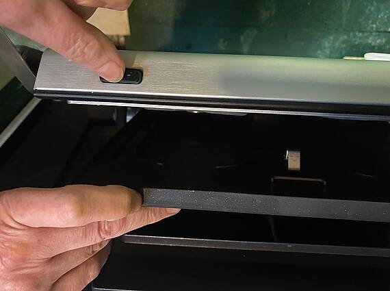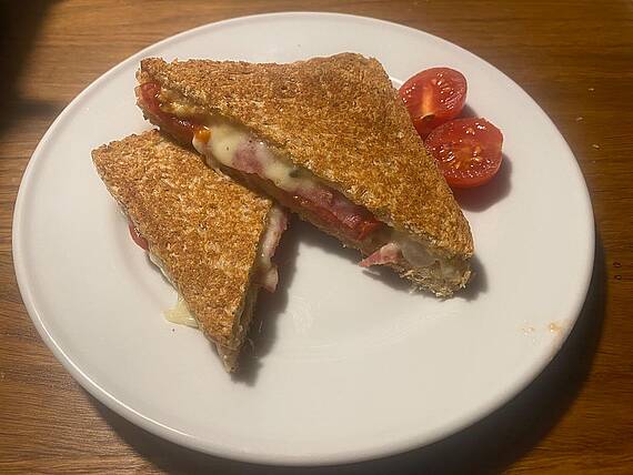 Also, los geht’s: Als Erstes traue ich mich an ein Sandwich ran. Dafür lege ich die passenden Platten ein, die einen hohen Rand haben, sodass Käse nicht aus dem Gerät laufen kann. Das geht wirklich einfach: Die Platten in zwei Aussparungen unten einlegen und einrasten lassen. Fertig. Dann das Menü einstellen. Die Bedienung ist intuitiv: Menütaste mehrfach drücken, bis das Sandwich-Pictogramm aktiviert ist, auf OK drücken und warten bis das Gerät aufgeheizt ist. Mit drei Piepsern signalisiert es: Ich bin bereit. Aufklappen, Toast reinlegen, zuklappen und warten. Auf dem Display kann man beobachten, wie die Zeit runtergezählt wird. Am Ende piept es wieder und der Toast ist fertig. Er ist perfekt: außen schön braun, innen saftig.