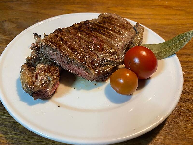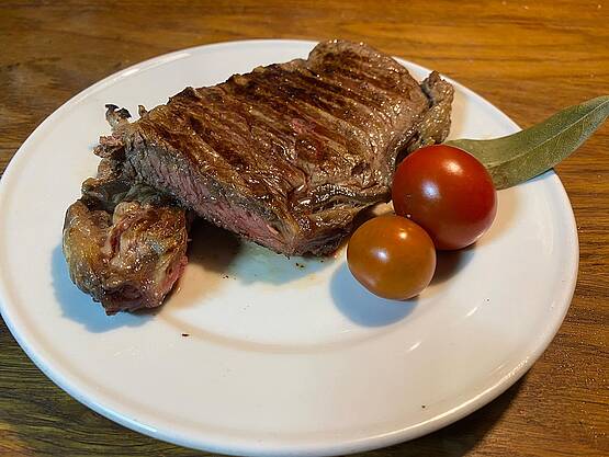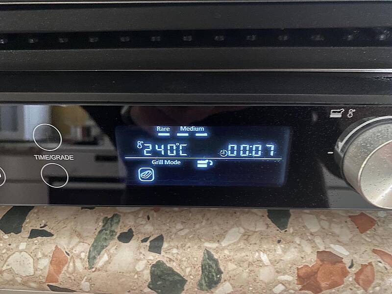 Das Reinigen ist einfach: Die Platten lösen, dafür den seitlichen bzw. oberen Knopf drücken und sie dann mit etwas Spülmittel reinigen. Geht tadellos. Als Nächstes soll ein Steak gebraten werden. Ich bin gespannt, weil mir das sonst selten richtig gut gelingt. Zuerst die Grillplatten einlegen, Gerät schließen, dann über die Menütaste den Steak-Modus anwählen, mit OK bestätigen und wieder warten, bis der Grill fertig aufgeheizt ist. Das Steak auf die Platte legen, Deckel schließen und warten. Ein erstes Piepen zeigt an, wenn das Fleisch „rare“ gebraten ist. Nicht so mein Ding, also warte ich, bis es „medium“ anzeigt und hole es raus. Was soll ich sagen? Für mich sieht es perfekt aus und schmeckt auch so.