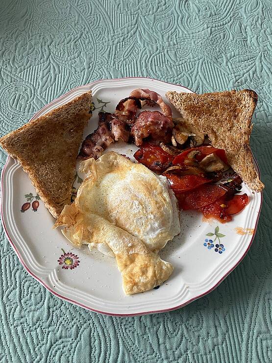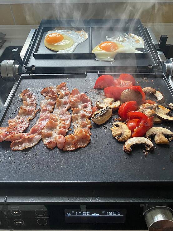 Am nächsten Morgen steht ein englisches Frühstück auf dem Plan: Der Grill wird auf der einen Seite mit der Toast-Platte für die Eier und auf der anderen mit der glatten Plancha-Platte ausgerüstet. Das Gerät um 180 Grad öffnen und los geht‘s. Da ich Spiegeleier, aber auch Speck, Tomaten und Pilze grillen will, benötige ich unterschiedliche Temperaturen. Dafür die Taste „Custom“ drücken, über die beiden Temperaturregler die gewünschte Gradzahl einstellen und mit „OK“ bestätigen. Im Display wird die aktuelle Gradzahl der jeweiligen Platten angezeigt. Zuerst brate ich Speck, Tomaten und Pilze, dann schlage ich die Eier in die Aussparungen der Toastplatte. Nach kurzer Zeit ist alles fertig und kann serviert werden – bestimmt nicht das letzte Mal.