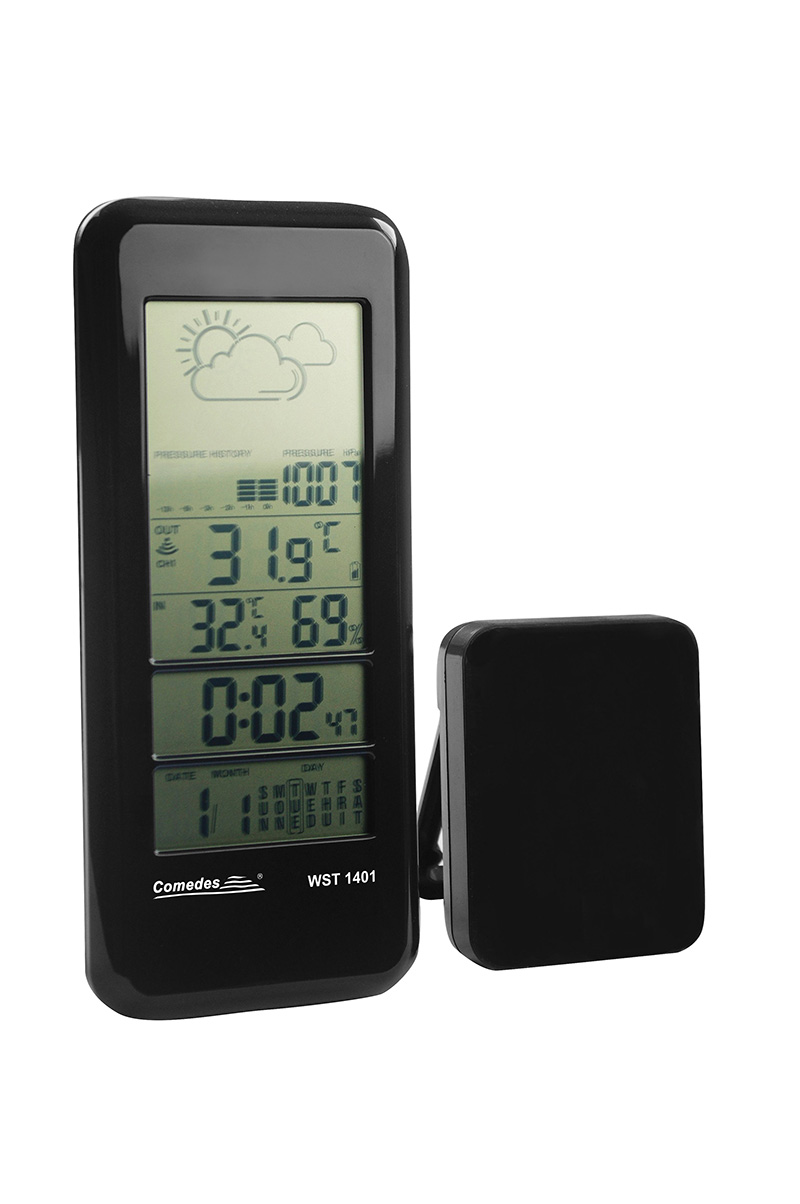 Die Comedes Wetterstation WST 1401 mit Außensensor ist eine prima Lösung für den privaten Einsatz. Das gut verarbeitete Gerät im formschönen Design zeigt die Innen- und Außentemperatur, Luftfeuchtigkeit und den Luftdruck.