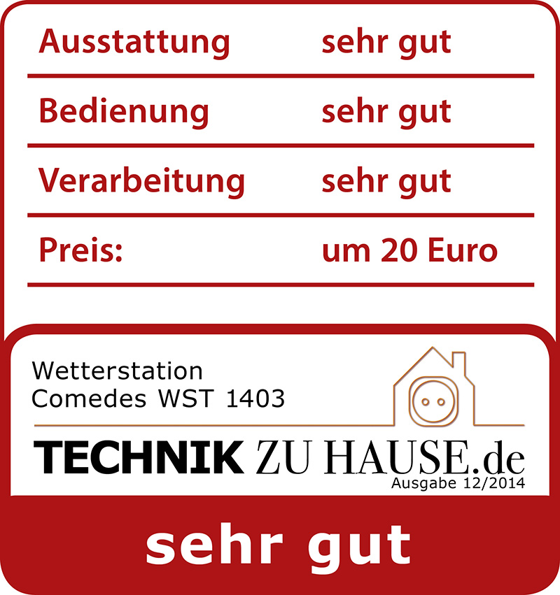 Die Comedes Wetterstation WST 1403 mit praktischem Aufstellbügel ist ein kleines, feines Gerät für zuhause oder auch auf Reisen. Gut verarbeitet und formschön im Design zeigt die WST 1403 Innentemperatur, die Luftfeuchtigkeit, Datum und Zeit. Sie bietet eine Wettervorschau in Form von Symbolen und ist außerdem mit einer praktischen Weckfunktion ausgestattet. Die Bedienung über insgesamt drei Tasten ist unkompliziert, die Daten auf dem großen Display sind gut lesbar. Mit einem Verkaufspreis von 20 Euro liefert die Comedes WST 1403 die wichtigsten Informationen über das Raumklima mit einer Messgenauigkeit (lt. Hersteller) von +/- 1%.