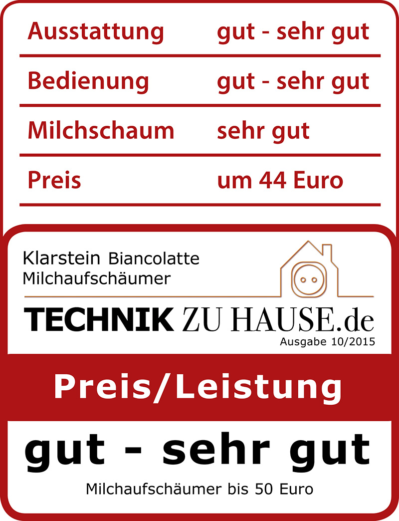 Der Klarstein Biancolatte Milchaufschäumer ist ein formschönes, einfach zu bedienendes und leise arbeitendes Gerät. Es fasst 100 ml Milch für Milchschaum, beziehungsweise 200 ml für das Erhitzen von Milch. Der antihaftbeschichtete Metallbecher ist mit entsprechenden Mengen-Markierungen versehen, die allerdings schlecht zu sehen sind. Die beiden unterschiedlichen Rührelemente lassen sich einfach wechseln. Im transparenten Deckel mit Dichtungsring kann jeweils ein Rührelement aufbewahrt werden. Der Klarstein Biancolatte wird über zwei Tasten bedient, die während des Betriebs leuchten und rund 30 Sekunden blinken, wenn der gewählte Vorgang abgeschlossen ist. Der Behälter mit angedeuteter Tülle liegt gut und sicher in der Hand. Auch die Reinigung des Milchaufschäumers ist schnell erledigt. Der Klarstein Biancolatte hat einen Verkaufspreis von rund 44 Euro.
