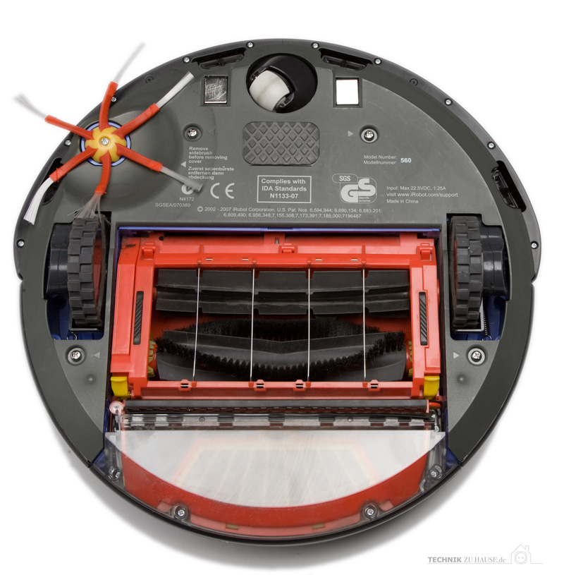 Mit einem Griff lässt sich der Schmutzpartikelfilter nach hinten hin wegziehen und dann leeren. Hier sitzt auch ein abwaschbares Filtersieb. Ein weiteres liegt dem Gerät als Zubehörteil bei und kann zudem später nachgekauft werden. Dreht man den iRobot Roomba auf den Rücken, wird sein modularer Aufbau sichtbar. Alle Bestandteile sind farbig gekennzeichnet, zur gründlichen Reinigung müssen einige Element mit einem Schraubendreher ausgebaut werden. Alle gelben Bestandteile lassen sich ohne Werkzeug entfernen oder öffnen und somit leicht und gründlich reinigen. So sind zum Beispiel die Bürsten nach dem Aufklappen einer Halterung leicht herausnehmbar.