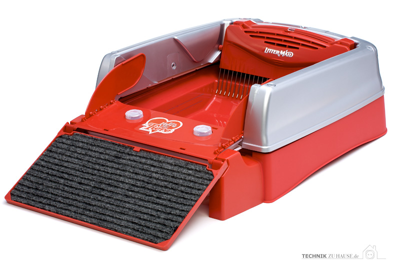 Die Litter Maid bietet eine große Wanne für Katzenstreu, die deutlich größer ist als bei den meisten "normalen" Katzentoiletten. Über eine kleine Rampe an der Vorderseite kann die Katze bequem in ihr Reich eintreten. Wie funktioniert nun die Selbstreinigung? Zehn Minuten, nachdem die Katze ihr Geschäft gemacht hat, wird ein großer Stahlrechen motorisch betrieben über die Streu gefahren und bis zur Eingangsrampe bewegt. Dabei bleibt die geklumpte Streu an den Zinken des Rechens hängen, wird zur Rampe bewegt und verschwindet dort unter einer Klappe in einer Entsorgungsbox.