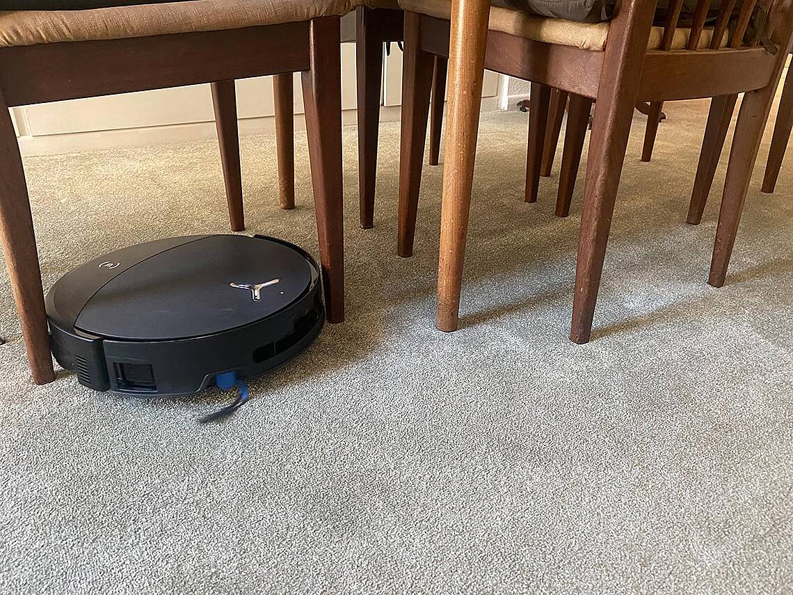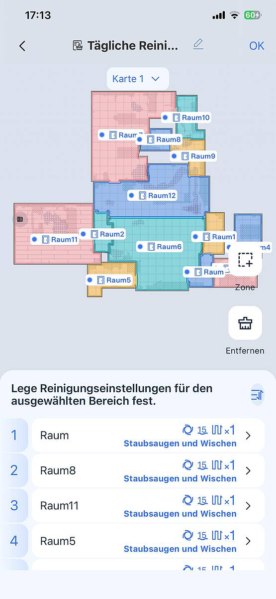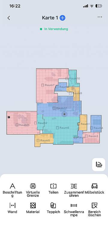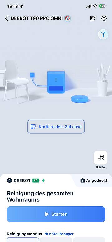 Um allein arbeiten zu können, muss der DEEBOT sein Reinigungsgebiet kennenlernen und kartieren. Dafür vorher lose rumliegende Gegenstände, wie Kabel, Schuhe etc. vom Boden entfernen, Engpässe beseitigen und Teppichfransen nach unten einschlagen – nach einigen Reinigungsrunden stelle ich fest, dass das nur bei längeren Fransen nötig ist. Als der Roboter meldet, dass er aufgeladen ist, klicke ich auf „Kartiere dein Zuhause“ und schon startet er, fährt herum, dreht sich und zieht seine Bahnen. Bei diesem Kennenlernen verfolge ich ihn. Einerseits, weil ich neugierig bin, anderseits, weil es doch noch die eine oder andere Stelle gibt, die ich für ihn räumen muss. Auf dieser Strecke scannt er mit der AIVI 3D 4.0-Technologie Wände, Möbel und Hindernisse, um eine erstaunlich genaue Karte des Arbeitsbereichs zu erstellen. Die kann hinterher noch bearbeitet werden, um zum Beispiel No-go-Areas einzurichten, empfindliche Teppiche vom Reinigen auszunehmen oder Möbel zu schützen.