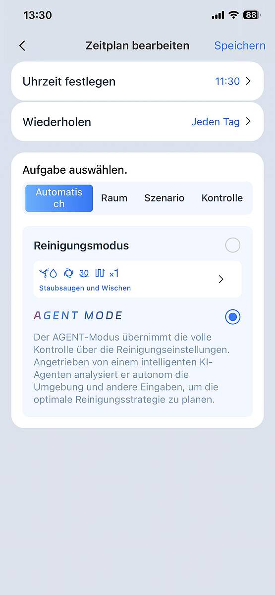 Ist der DEEBOT T90 PRO OMNI einmal angelernt, lässt er sich einfach aktivieren: entweder über die App oder auch über AGENT YIKO, einem smarten KI-Sprachassistenten, der in der App aktiviert werden muss. Er führt nicht nur Aufträge aus, sondern plant auch eigenständig die Reinigungsroute und -kraft. Ich programmiere zwei Zeitpläne: Vormittags soll er das ganze Haus reinigen, abends noch einmal die meist genutzten Räume. Ich klicke jeweils den „AGENT-Modus“ an, damit der intelligente KI-Assistent selbst eine Reinigungsstrategie plant. Einmal losgelassen, fährt der Kleine munter durch die Räume und beginnt in zwei Arbeitsgängen zu saugen und zu wischen. Mit dem Seitenpinsel erwischt er auch schwer zugängliche Krümel, an geraden Wänden fährt er seine Walze aus. Das Ergebnis: Er saugt erstaunlich gründlich und auch beim Wischen macht er eine gute Figur: Alles wird blitzeblank und trocknet schnell. Selbst eingetrocknete Joghurtflecken oder Kuchenteig sind für ihn kein Problem. Der DEEBOOT scheint anfangs etwas unkoordiniert hin- und herzufahren, aber er lernt und zieht nach wenigen Einsätzen ruhig seine Runden. Dabei ist er sehr leise, leiser als ich es von anderen Saugrobotern kenne. Spannend: Wenn der Roboter an eine höhere Schwelle kommt, löst er dieses Problem sehr intelligent und auf verschiedene Arten: Erst dreht er sich und versucht, mit einer anderen Rollenstellung über die Schwelle zu kommen. Klappt das auch nicht, dreht er sich wieder, kommt er dann immer noch nicht vorwärts, nimmt er Schwung – und voilá, überwunden ist das Hindernis! Während der Reinigungsphase fährt der Roboter immer mal wieder zur Basisstation, um die Walze zu reinigen, Staub- oder Schmutzwasserbehälter zu leeren oder um ruckzuck zu laden. Das alles entscheidet der DEEBOT T90 PRO OMNI selbst und sehr effizient. Nach getaner Arbeit entleert sich der Roboter in der Station, reinigt die Wischmopp-Walze gründlich und trocknet sie mit Warmluft.