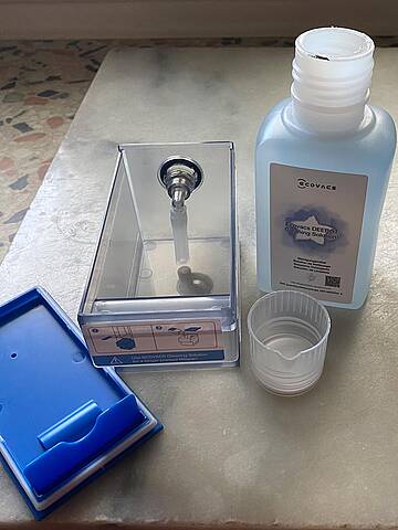 Die OMNI-Basisstation wird an einer gut zugänglichen Wand mit starkem WLAN-Signal aufgestellt. Dann den Frischwassertank und den Behälter mit der Reinigungslösung befüllen, das Gerät an den Strom anschließen, es am Hauptschalter unter der Abdeckung am Roboter anschalten und los geht’s. Zum Downloaden der App den QR-Code neben dem Schalter scannen. Wer schon ECOVACS-Geräte besitzt, kann sich diesen Schritt sparen und das Gerät in die vorhandene App einpflegen. Dann folge ich den Anweisungen auf der App, um sie mit WLAN und dem DEEBOT zu verbinden. Das dauert nicht lange und ist kinderleicht.