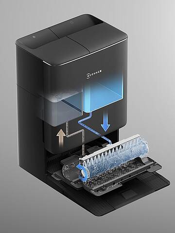 Dreh- und Angelpunkt des DEEBOT T90 PRO OMNI ist die OMNI-Basisstation. Sie ist die Homebase des Saugers, lädt ihn auf, versorgt ihn mit Frischwasser und Reinigungsmittel, nimmt Schmutzwasser und Staub auf, reinigt und trocknet den Wischmopp. Je nach Verschmutzungsgrad wird dafür 40 bis 75 Grad heißes Wasser benutzt. Dem folgt ein warmes Luftbad, damit die Rolle nicht zu müffeln beginnt. Zum Frischwassertanken, Ausleeren und Reinigen des Mopps kehrt der Roboter bei Bedarf auch zwischendurch zur Basis zurück.