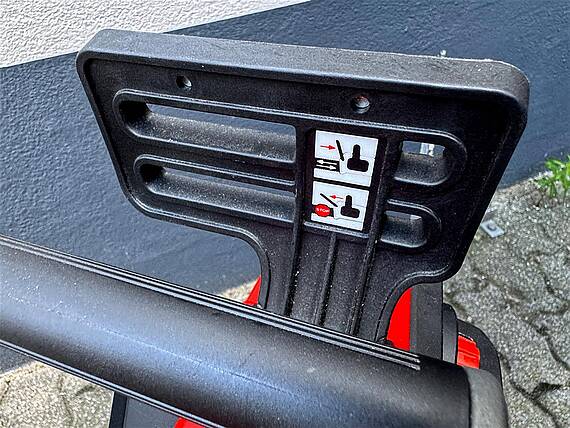 Vor dem vorderen Handgriff sitzt der heute übliche Handschutz, der sofort die Kettenbremse auslöst, wenn die Säge durch Kickback hochschnellt. Eine Einschaltsperre, der Kettenfangbolzen und eine kleine, aber stabile Anschlagkralle aus Metall sorgen zusätzlich für Sicherheit bei der Arbeit mit der Kettensäge.
