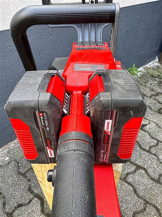 Wie üblich müssen die beiden Akkus separat erworben werden und sind natürlich mit dem Einhell Power X-Change-System kompatibel. Laut Hersteller sollten diese Batterien mindestens 3.0 Ah Kapazität haben; in der Praxis empfehlen wir allerdings mindestens die im Test verwendeten 4.0 Ah-Akkus als Untergrenze. Im Netz berichten viele Anwender von guten Erfahrungen mit den großen 5,7 Ah-Akkus. Das klingt nachvollziehbar, allerdings wiegt die einsatzfähige Säge dann aber auch gleich fast sechs Kilo. Vier Kilo entfallen dabei auf die Säge selbst und genau 1,76 kg auf die beiden Stromspeicher.