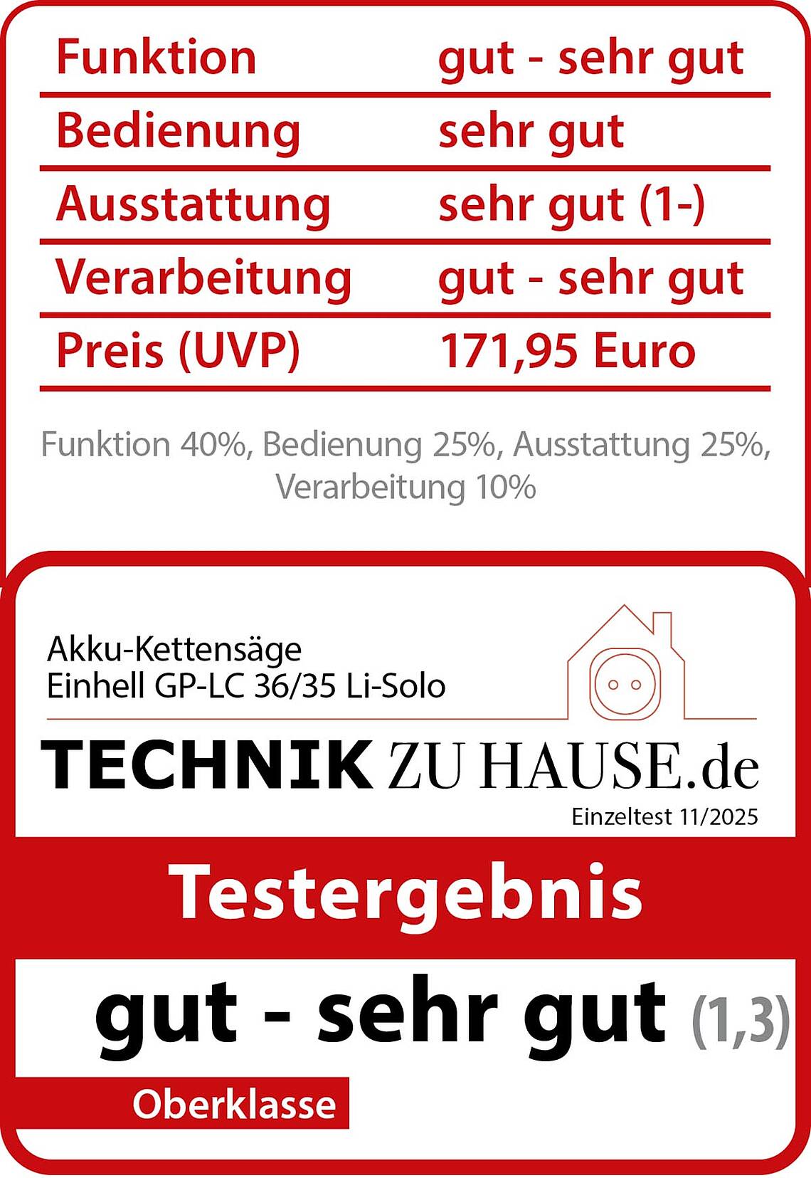 Insgesamt stellt sich die Frage, für wen die Einhell GP-LC 36/35 eigentlich gedacht ist. Denn ähnlich große Sägen mit Benzinmotor gibt es selbst von etablierten Spezialmarken bereits für durchaus vergleichbare Grundpreise. Mit diesen Sägen kann die Akku-Einhell in Sachen Power und Schnittleistung nicht ganz mithalten, und zu allem Überfluss sind die kleinen Verbrenner-Sägen oft sogar leichter als die Einhell mit zwei dicken Akkus.