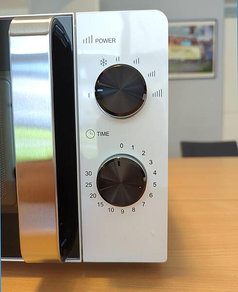 Das Bedienfeld der HMW 8858 ist übersichtlich und selbsterklärend. Am oberen Drehregler stellt man die Stufe ein, am unteren die Dauer, maximal 30 Minuten. Die Einstellung der Stufen ist von I bis IIIII unterteilt, zusätzlich gibt es noch „Auftauen“. Stufe IIIII entspricht laut Bedienungsanleitung 700 Watt und 100 Prozent der Leistung, Stufe „Auftauen“ etwa 300 Watt (42 %). Jetzt kann man spaßeshalber die Prozentangaben aus der Bedienungsanleitung für die anderen Stufen auch in Watt umrechnen, was wir natürlich getan haben. Das Ergebnis: Stufe I – 20 % – 140 Watt, Stufe II – 52 % – 364 Watt, Stufe III – 73 % – 511 Watt, Stufe IIII – 88 % – 616 Watt. Im Alltag ist das wahrscheinlich aber weniger wichtig, denn nach den ersten Versuchen bekommt man schnell ein Gefühl dafür, mit welcher Einstellung man die gewünschten Ergebnisse erzielt.