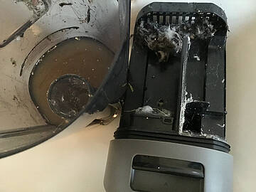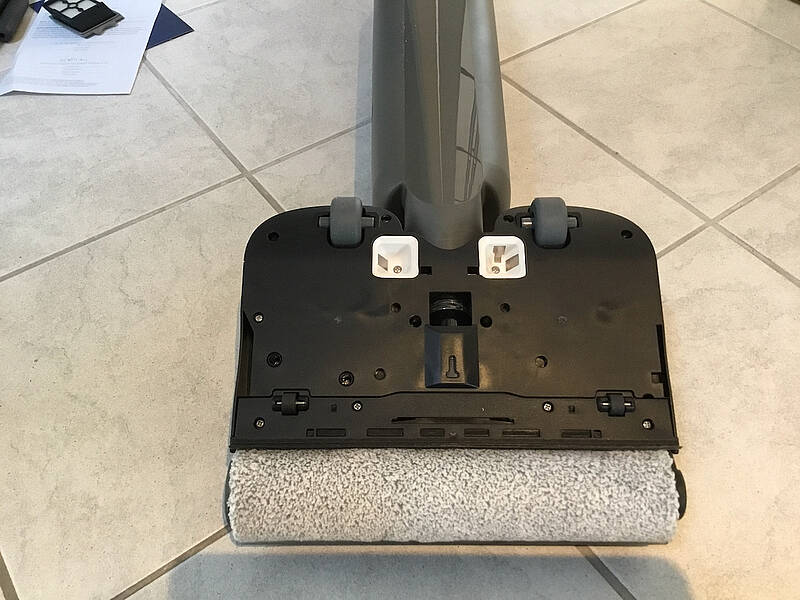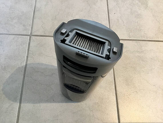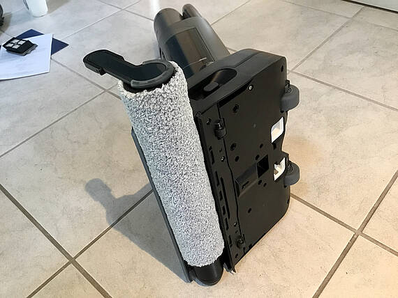 Für die Selbstreinigungsfunktion, die nach jedem Einsatz erfolgen sollte oder bei großen bzw. stark verschmutzten Flächen auch mal zwischendurch, bezieht der Nass-Trockensauger seinen Platz in der angeschlossenen Lade-Waschstation. Wichtig: der Schmutzwassertank sollte entleert sein, der Frischwassertank mindestens zu 40% befüllt und der Akku einen Ladestatus von mehr als 25 % haben. Jetzt braucht es nur noch einen Druck auf die Taste „Selbstreinigung“ am Gerät und schon beginnt das Prozedere, das akustisch etwas intensiver ausfällt und nach wenigen Minuten (Waschen und Trocknen) erledigt ist. Das Ergebnis ist eine schön saubere und flauschige Bürstenrolle. Den Schmutzwassertank kann man mit wenigen mühelosen Handgriffen entfernen. Während das brackige Wasser im Ausguss landet, lassen sich Schmutzpartikel und Flusen mit dem Reinigungswerkzeug leicht entfernen. Auch die Reinigung des Behälters unter fließendem Wasser ist gleich erledigt. Ebenso einfach gestaltet sich das Saubermachen der Bürstenkammer. Damit die Kammer gut zugänglich ist, löst man den Frischwassertank und die Bürstenrolle, entfernt mit dem Reinigungswerkzeug Schmutz- und Staubpartikel und wischt die Fläche mit einem feuchten Tuch ab.