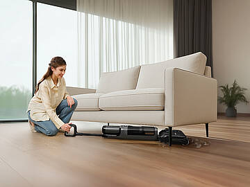 Auch im Badezimmer sind Haare, Staub, der mit sich mit Duschfeuchtigkeit verbindet und kleine Wasserpfützen für den Tineco kein Problem. Was uns vollends überzeugt hat, ist die maßvolle Abgabe des Wassers. Gerade Holz-, Dielen- und Parkettböden sind sehr empfindlich und wünschen sich eine leicht nebelfeuchte Reinigung. Hier macht der Nass-Trockensauger auf ganzer Linie Bella Figura. Er entfernt Staub, der gerade in der kalten Jahreszeit durch die Heizungsluft am Boden hängt, vortrefflich und hinterlässt nur einen zarten feuchten Film, der den Böden keinen Schaden zufügt. Das Ergebnis ist perfekt! Bei kurzen Pausen, um ein Möbelstück zu verrücken oder den Teppich hochzuschlagen, kann man den Tineco einfach aufrecht parken und er unterbricht automatisch den Arbeitsmodus. Damit man gut an Kanten und Ecken ran kommt ist das Schwenken um 45° nach rechts oder links eine sehr komfortable Funktion. Ebenso praktisch zeigt sich der FLOOR ONE i6 STRETCH PLUS bei der Reinigung unter Sofas, Betten und Möbeln. Er lässt sich ganz einfach um 180° nach unten kippen, so dass er flach wie eine Flunder (Höhe knapp 13 cm) und hervorragendem Bodenkontakten sehr angenehm und rückenschonend die Bodenreinigung erledigt.