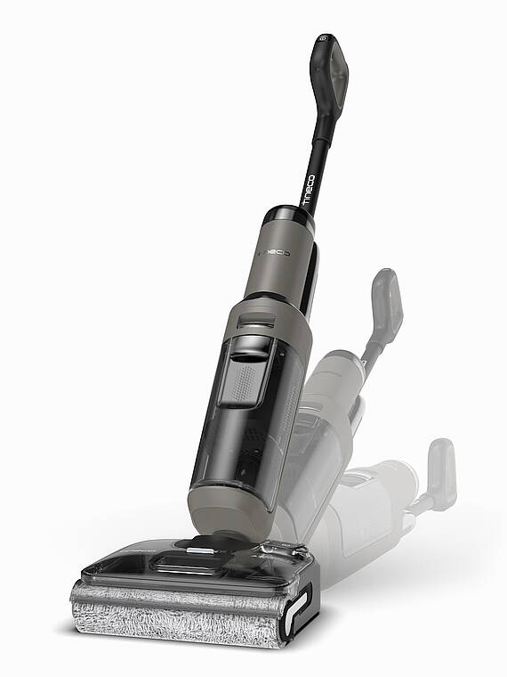 Mit dem FLOOR ONE i6 STRETCH PLUS hat Tineco einen stattlichen Reinigungsexperten im Portfolio, der als Nass-Trockensauger unterschiedlichste Hartböden von Schmutz und Staub befreit – und das in einem Arbeitsschritt. Das hervorragend verarbeitete Gerät bringt Maße von 112 cm x 26 cm x 22 (Höhe x Breite x Tiefe) und ein Gewicht von rund 4,5 kg an den Start. In ihm verbaut sind ein Frischwassertank für maximal 800 ml und ein Schmutzwassertank für maximal 720 ml – so kommt konsequent nur sauberes Wasser zum Einsatz. Zudem ist ein kleiner, herausnehmbarer Trockenfilter integriert, der große Partikel filtert, damit Feststoffe und Flüssigkeiten voneinander getrennt bleiben. Der Vorteil daran ist, dass der Motor geschützt wird und die Saugkraft konstant hoch bleibt. Damit Haare und Tierfell sich nicht in der Bürste verheddern können, ist eine Art Kamm im i6 STRETCH eingebaut – Tineco nennt das Anti-Verhedderungs-Design. Für die gründliche Reinigung sorgt eine Rollenbürste, die in doppelter Ausführung geliefert wird und via Bürstenmotor 450 Umdrehungen pro Minute auf´s Parkett (und andere Böden) legt. Schön praktisch für die Bedienung sind das 45° Schwenk-Design, mit dem man den Nass-Trockensauger prima nach rechts und links manövrieren kann und das Absenken um 180° - so zeigt sich der Tineco flach wie eine Flunder und kommt mit einer Liegehöhe von knapp 13 cm unter viele Möbel.