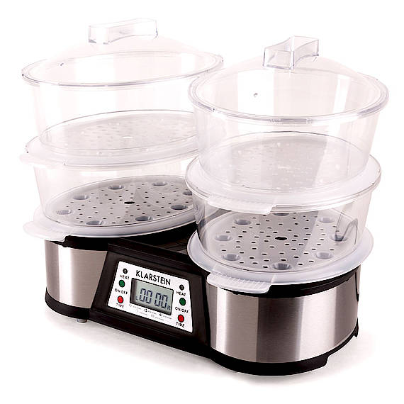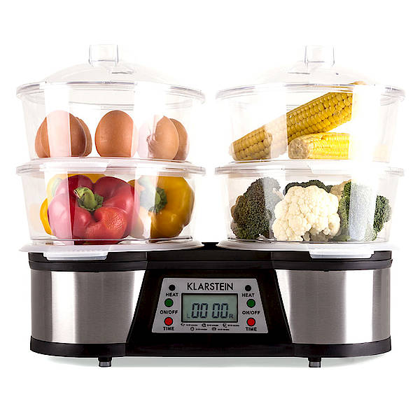 Im Grund kann alles, was auf dem Herd zubereitet werden kann, auch in den Dampfgarer. Der Klarstein Twin Peak bietet mit zwei separaten Garbereichen und insgesamt vier Behältern a. ca. 2 Litern Inhalt ideale Voraussetzungen für diese gesunde Zubereitungsmethode. Das Gerät ist blitzschnell bereit für den ersten Einsatz. Zunächst wird bis zur Markierung rund 3 Liter Wasser in die Basis gefüllt. Wird der Wasserstand während des Betriebs zu gering, erscheint eine Warnung auf dem Display. Durch eine Einfüllöffnung kann weiteres Wasser hinzugegeben werden.