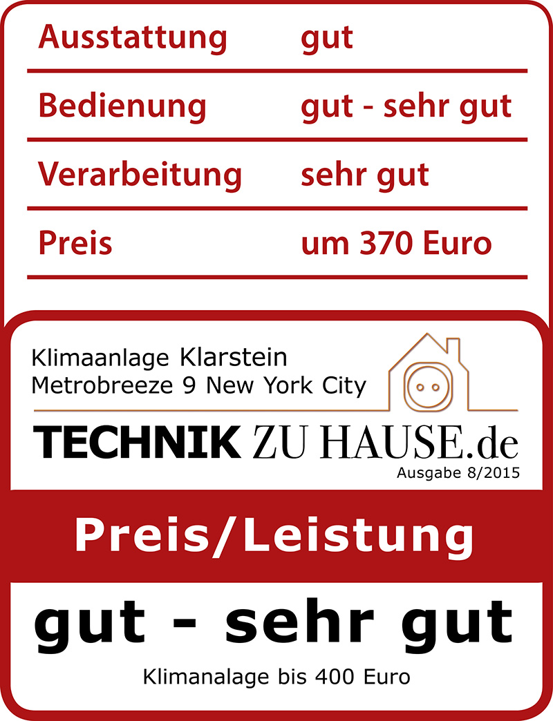 Im Lieferumfang enthalten ist ein Set zur Fensterabdichtung, dass bei vergleichbaren Geräten oft hinzugekauft werden muss. Das Gerät kann auch als Luftentfeuchter eingesetzt werden; hierzu muss allerdings ein Schlauch für den Wasserablauf montiert werden, ein zusätzlicher entnehmbarer Tank wäre von Vorteil. Mit einem Verkaufspreis von rund 370 Euro ist die Klarstein Metrobreeze 9 New York City eine gute bis sehr gute Empfehlung.