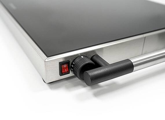 Bei allen Versuchen blieb der Griff immer kühl auf Raumtemperatur. Er ist so gut von der Platte isoliert, dass die eingestellte Temperatur überhaupt keinen Einfluss hat – selbst auf der höchsten Stufe 12. Ungünstig fanden wir zunächst, dass Ein-Aus-Schalter, Drehregler, Griff und die Buchse für das Netzkabel alle zusammen auf einer der Längsseiten angebracht sind. Stellt man die Platte mit dem Schalter und dem Regler nach vorn auf, um sie bedienen zu können, hängt dort ebenfalls das Kabel. Andererseits ist es deutlich sicherer, wenn man diese Seite und alle Bedienelemente nach hinten dreht, sodass während des Betriebs niemand versehentlich die Temperatur verstellt, am Kabel hängenbleibt oder Kinder sich am Griff festhalten.