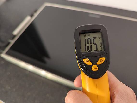 Nach dem Erreichen der 30° C haben wir den Regler auf 5 gestellt und nach weiteren 10 Minuten gemessen, dass die angegebenen 55° C erreicht wurden, wobei auch hier wieder die Ränder etwas darunter lagen. Zu guter Letzt haben wir auch noch die höchste Stufe 12 ausprobiert. Um auf die Temperatur von ca. 105° C zu kommen, benötigt die kalte Platte ebenfalls 20 Minuten in einem eher kühlen Raum.