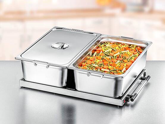 Und wo wir gerade bei Normen sind: Es gibt die sogenannten Gastronormbehälter, in denen z. B. Speisen für Catering oder bei Buffets aufbewahrt werden. Die Warmhalteplatte WPR 307/E ist mit ihren Maßen genau für einen dieser Behälter geeignet. Mit der WPR 407/E bietet Rommelsbacher außerdem eine Warmhalteplatte in der doppelten Größe an, die ansonsten genau identisch zur WPR 307/E ist. Auf ihr finden zwei dieser Gastrobehälter Platz.
