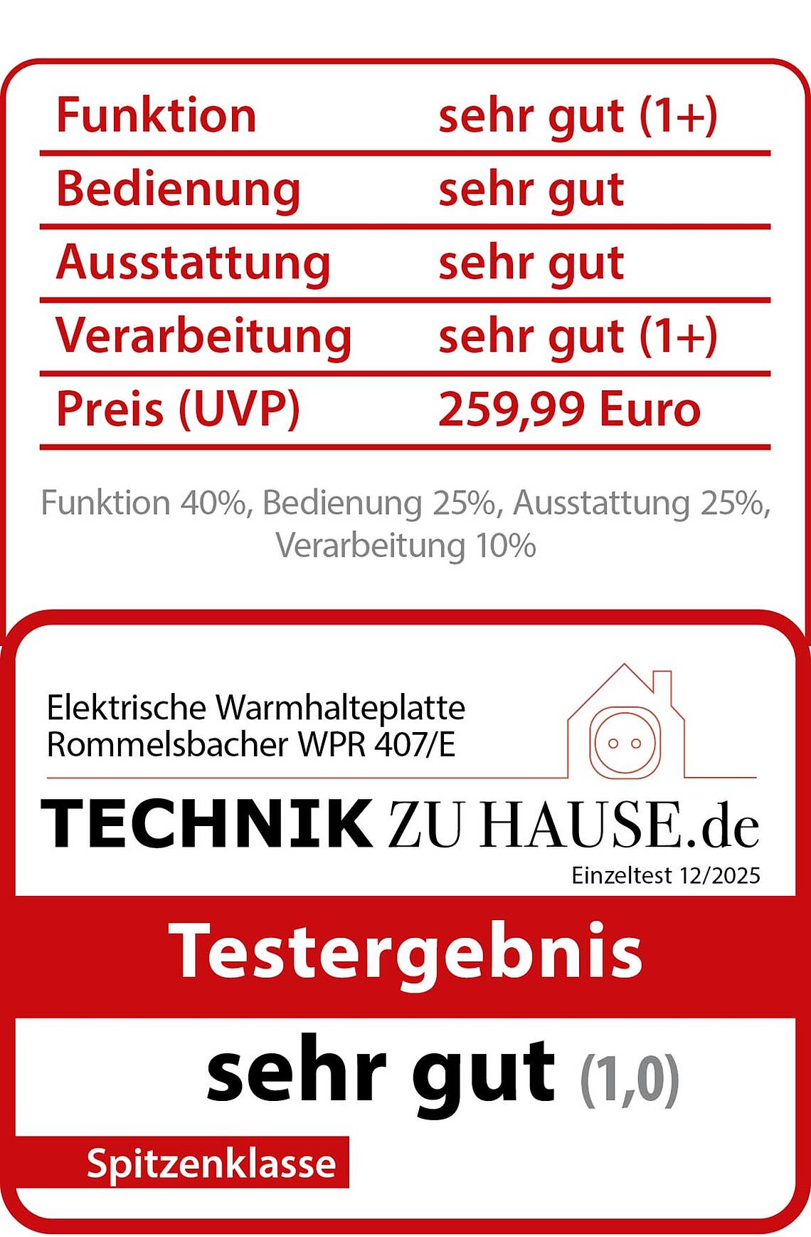 So bleiben alle Speisen lange warm:Warmhalteplatte WPR 307/E von Rommelsbacher im Test Testredakteurin: Sarina Stützer, 9. Dez. 2025, Fotos: Hersteller, Technikzuhause