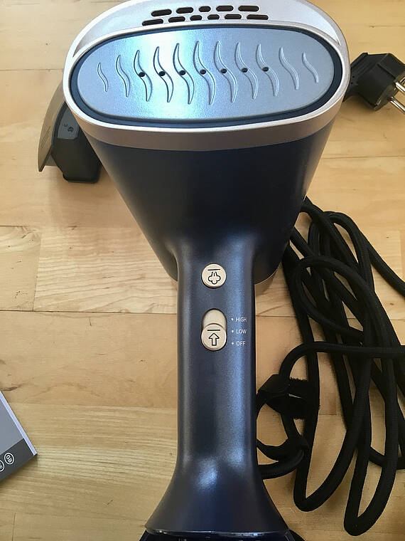 Für die erste Testrunde wählen wir den Einstellungsmodus „OFF“. D.h. das Gerät arbeitet nur mit Dampf und Wärme und ohne Saugkraft – ideal für sehr empfindliche Materialien, wie unseren Kaschmirpullover. Wir halten die Dampftaste gedrückt und mit einigen horizontalen und vertikalen Bewegungen und einer guten Portion Dampf sind die unschönen Falten in kurzer Zeit Geschichte und zurück bleibt ein flauschig, knitterfreies Ergebnis – sehr schön! Für das Synthetikgewebe wählen wir die Einstellung „Low“; sie funktioniert mit Dampf, Wärme und niedriger Saugkraft und ist für semi-empfindliche Stoffe konzipiert. Wir nehmen einen Rock und ein Kleid in Angriff. Beides ist durch das Verstauen im Schrank ziemlich faltig geworden und braucht jetzt sozusagen einen Refresh. Die sanfte Saugkraft ist im Einsatz sofort spürbar. Der Steamer zieht die Stoffe leicht aber deutlich spürbar an die beheizte Keramikplatte, hält sie in Position – so dass Dampf und Wärme punktgenau wirken können. Während wir mit dem Gerät peu a peu die Falten glätten, halten wir mit der freien Hand die Kleidungsstücke an anderer Stelle fest - so werden die Resultate perfekt. In Stufe „Hoch“ widmen wir uns dem robusten Baumwollgewebe. Hier zeigt sich die Saugkraft spürbar stärker und zusammen mit Dampf, Wärme und Keramiksohle bekommen wir auch tiefe Knitter aus dem Shirt.