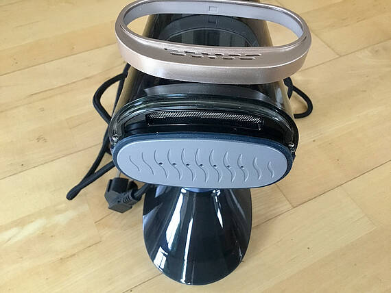 Der Russell Hobbs Steamer ist für den vertikalen Einsatz gedacht. Dafür sollen die Kleidungsstücke auf einem Bügel frei aufgehängt werden, damit durch Dampf und Hitze in der Nähe befindliche Utensilien keinen Schaden nehmen. Wie empfohlen platzieren wir verschiedene Textilien aus Baumwolle, Kaschmir und Synthetik auf Kleiderbügeln und hängen sie am Wäscheständer auf. Der Wassertank lässt sich prima vom Gerät abziehen und ist schnell mit 200 ml (Max-Markierung beachten) destilliertem Wasser aufgefüllt – obwohl die Einfüllöffnung nicht so geräumig ausfällt. Mit der stattlichen Länge von 3 Metern bietet das Kabel Bewegungsfreiheit und macht den Weg zur nächsten Steckdose leicht. Da die Steam Genie VacuSteam Dampfbürste mit einem Sockel ausgestattet ist benötigen wir keine spezielle Parkstation, wie beispielsweise beim Dampfbügeleisen; hier ist alles sicher. Mit einem Knopfdruck der ON-/OFF-Taste signalisiert der Steamer mit blauem Blinklicht die Aufheizphase. Nach knapp 35 Sekunden leuchtet das Licht dauerhaft blau und die Dampfbürste ist einsatzbereit – eine Zeitspanne, die absolut überschaubar ist.