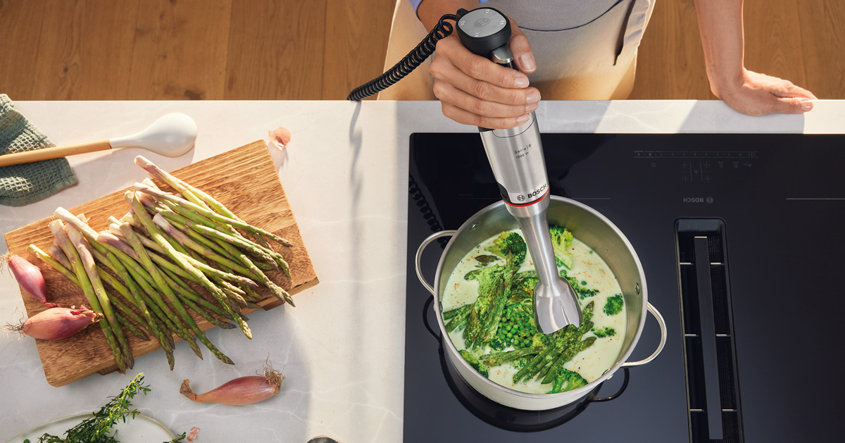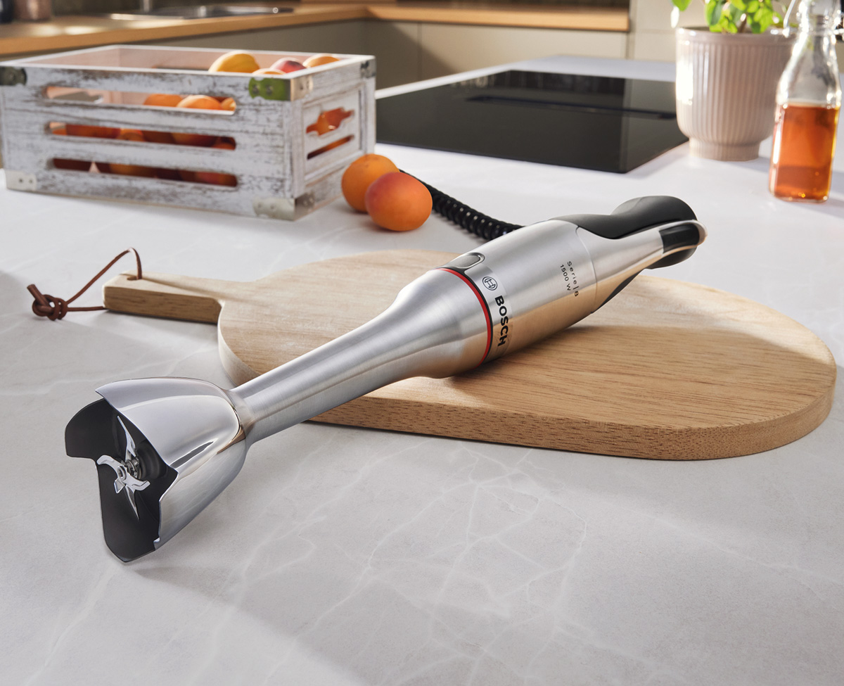 Als erster Stabmixer von Bosch verfügt der neue ErgoMaster Serie 8 über sechs Klingen, zwei große und vier kleine und optimierter Mixglocke. So werden noch feinere Ergebnisse in kürzester Zeit erzielt. Dank seines ergonomischen Designs verspricht er eine gute Handhabung und lässt sich auch einhändig bedienen.