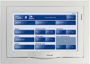 Das KNX Touch-Panel 7 dient als Anzeige- und Steuereinheit der Hauselektronik wie beispielsweise Licht, Heizung oder Jalousien. Die große Ausstattung überzeugt: neben Alarmmodul und Zeitschaltuhr gibt es zusätzliche Funktionen wie dynamische Sprachumstellung oder Anwesenheitssimulation. Dank unbegrenzter Anzahl von Bedienseiten können ganze Szenarien gesteuert werden. Im Standby Modus kann darüber hinaus eine Diashow gezeigt werden.