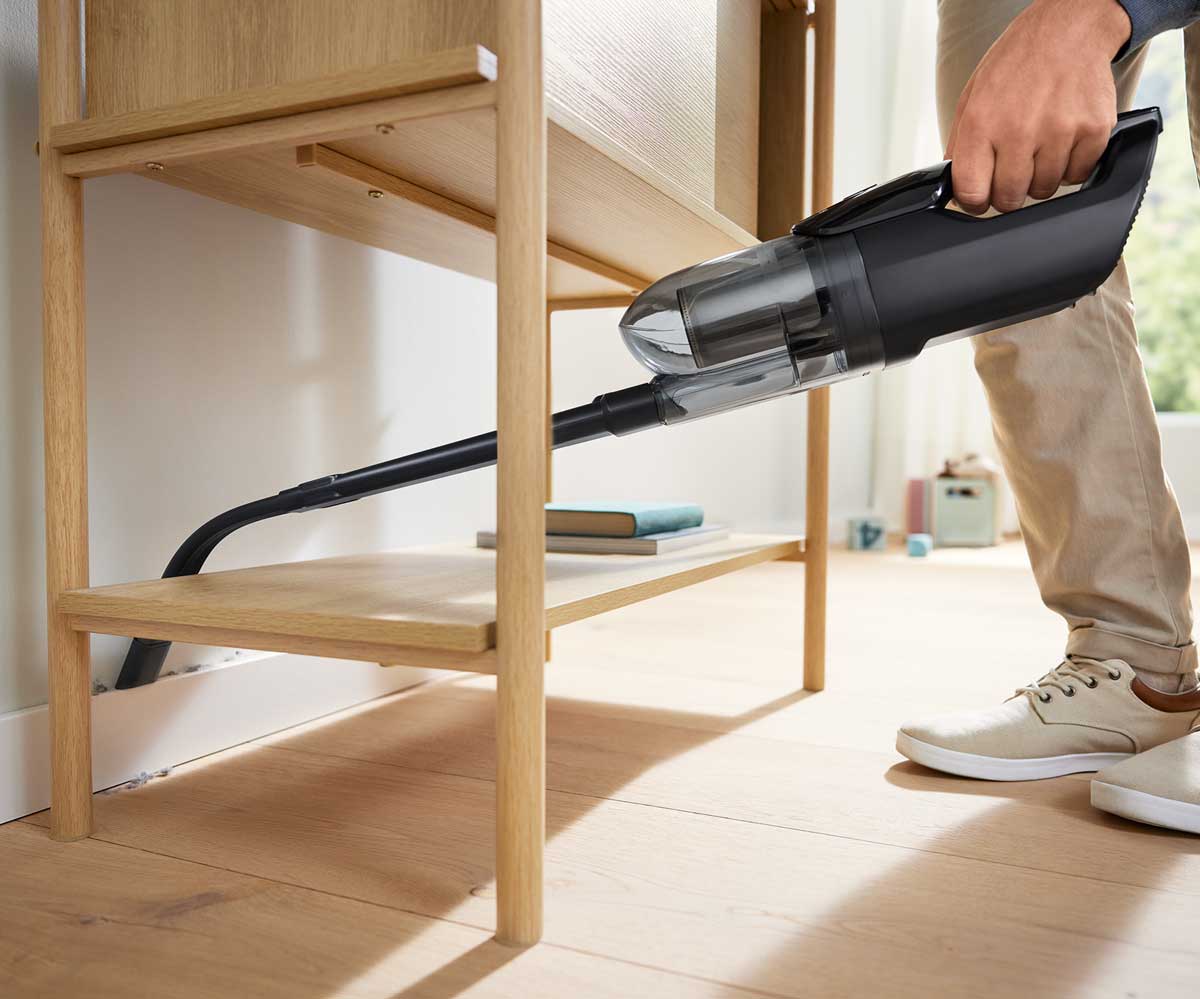 Der neue Flexxo Serie 4 lässt sich mit nur einem Knopfdruck vom Akku-Staubsauger in einen Handstaubsauger umwandeln. Zusätzlich ist er mit drei praktischen Zubehörteilen ausgestattet, die für beste Reinigungsergebnisse auf allen Ebenen sorgen: mit der ausziehbaren Fugendüse können selbst schwierige Ecken und hohe Decken erreicht werden und die 2in1 Möbel- und Polsterdüse macht die Reinigung spezieller Oberflächen besonders komfortabel. Das Beste: Das Zubehör ist direkt in das Gerät integriert und dadurch jederzeit griffbereit, wenn es benötigt wird.
