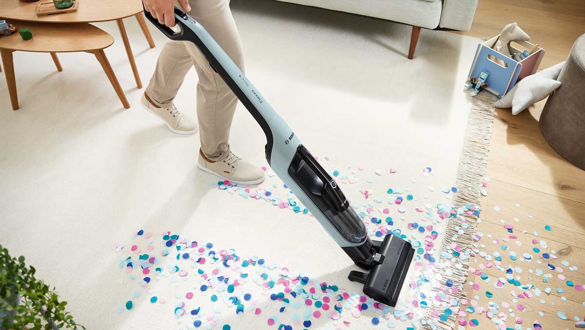 Dank der Laufzeit von bis zu 60 Minuten lässt sich der Hausputz in einem Rutsch erledigen – auch bei großen Häusern und Wohnungen, denn mit einer Akkuladung können laut Bosch bis zu 220m gereinigt werden. Ein farbiger Leuchtring zeigt an, wenn die Leistung nachlässt und der Flexxo geladen werden muss. Beim Saugen haben Nutzende die Wahl zwischen drei Leistungsstufen: Eco, Turbo und – ganz neu – Automatik. Diese passt die Saugleistung und Laufzeit automatisch an den Untergrund an, sodass Nutzer jederzeit von den optimalen Einstellungen profitieren.
