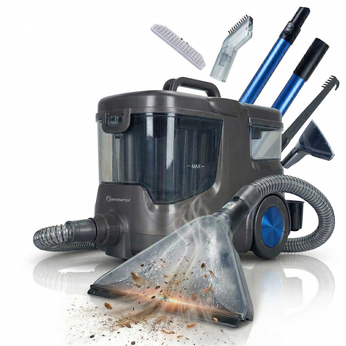 Die besonders kraftvolle Saugleistung und das durchdachte Doppeltanksystem machen den HYDRO 9000 MAX zu einem kompakten Top-Spezialisten für unterschiedlichste Einsatzgebiete. Besonders bemerkenswert ist die integrierte Dampffunktion. Denn dank dieser Technik soll das Kraftpaket selbst hartnäckigste Flecken, Tierhaare und Keime tief aus den Fasern heraus entfernen, und das ganz ohne Beutel.