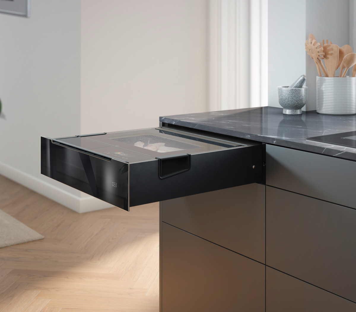Die Innovationskraft der Hausgeräteindustrie, intelligente Technologie sowie die Expertise und Kreativität ihrer Ingenieure, Entwickler und Designer haben es möglich gemacht: eine grifflose Schublade, hinter deren nur 14 cm hohen Glasfront ein vollausgestatteter Dampfgarer mit 10 Litern Kapazität steckt. Temperatur und Zeit werden über ein in der Schublade integriertes Touch-Display eingestellt – ist man unsicher, welche Einstellungen die richtigen sind, wählt man eines der integrierten Automatikprogramme und zusätzliche per App. Das neue Dampfwunder lässt sich z. B. mit einem kompakten Einbau-Backofen kombinieren oder einzeln in einer Schublade platzieren – für maximale Flexibilität in der Planung.