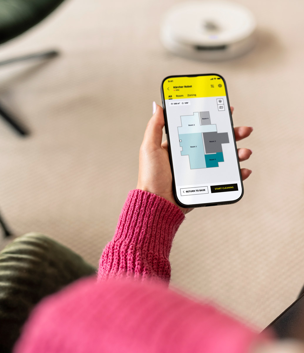 Die Bedienung erfolgt über die “Kärcher Indoor Robots”-App. Dort können zudem Reinigungsparameter wie Saugstärke oder Wassermenge individuell eingestellt oder Reinigungszyklen festgelegt werden.