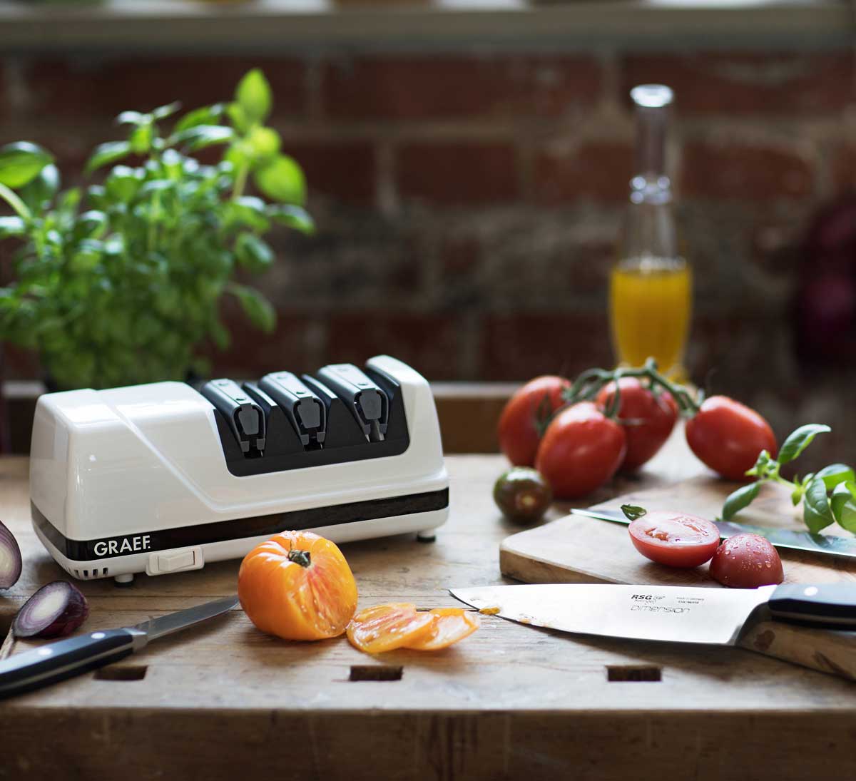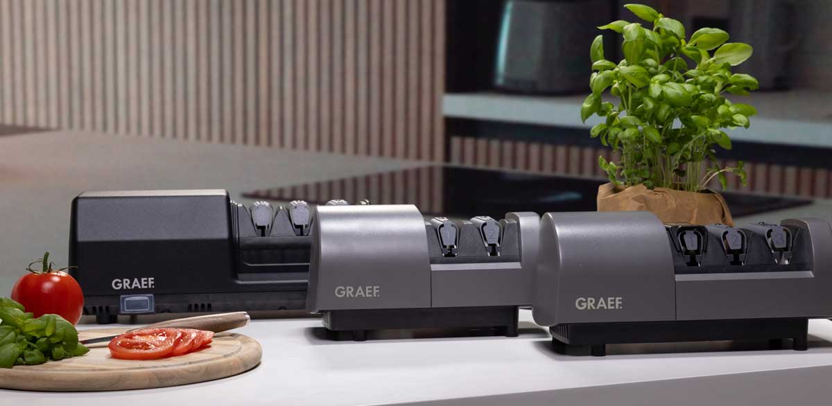 Für Hobbyköche, Alltagsschnippler und alle, die sich gerne in der Küche aufhalten und mit dem Zubereiten von kulinarischen Genüssen beschäftigen, ist ein scharfes Küchenmesser das Must-have für mehr Freude beim Kochen. Unter dem Slogan „Lang lebe dein Messer!“ spricht GRAEF seine Hauptzielgruppe an und verspricht perfekt geschärfte Messer mit Gelinggarantie, einen langen Klingenerhalt sowie den Aufbau beschädigter Klingen. Die Produktrange reicht hier vom manuellen Einsteigermodell über ein Hybridmodell in neuem Design bis hin zu elektrischen Modellen wie dem SG530 für 20°-Klingen oder Modelle speziell für asiatische Messer mit 15°-Klingen. An der Spitze der Range steht das Profimodell SG2000 für den Einsatz in gewerblichen Küchen. Die Modelle mit drei Stufen eignen sich dabei auch für den Klingenaufbau kaputter Messerschneiden – damit das Messer „lang lebe“.