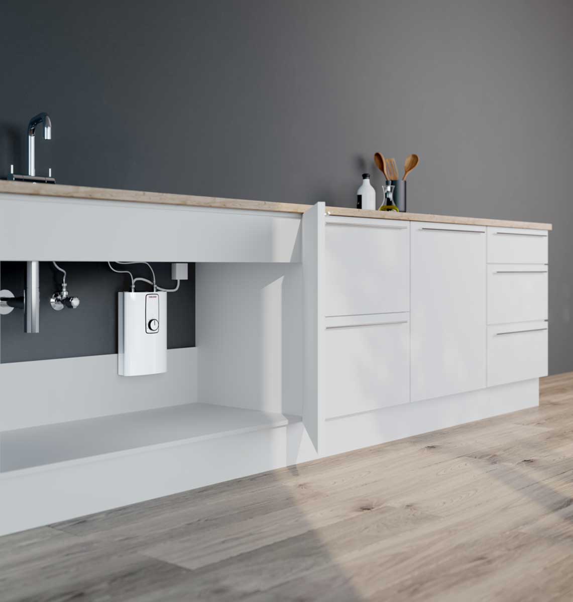 In Einfamilienhäusern wird das Warmwasser häufig in einem Speicher im Technikraum vorgehalten. Lange Leitungswege in die Küche führen allerdings zu Energieverlusten und mitunter langen Wartezeiten, da das stehende Wasser abkühlt und es einige Minuten dauern kann, bis wieder warmes Wasser aus der Zapfstelle fließt. „Das verhindern ein Durchlauferhitzer oder Kleinspeicher, die einfach in der Küche installiert werden“, sagt Max. Welches Gerät das richtige ist, hängt vom Warmwasser-Bedarf ab. „Elektronische Durchlauferhitzer erwärmen das einströmende kalte Wasser beim Durchfließen. Damit kommt es sekundenschnell und gradgenau im Waschbecken an“, sagt Max. Dabei arbeiten die Geräte äußerst effizient, denn sie erwärmen nur so viel Wasser, wie gebraucht wird, auf genau die Temperatur, die gewünscht ist. „Es wird also nicht Wasser auf Vorrat erhitzt, dem dann an der Zapfstelle wieder umständlich kaltes Wasser beigemischt werden muss, um die Wunschtemperatur zu erreichen.“ Die Wunschtemperatur wird komfortabel am Drehregler oder Multifunktionsdisplay eingestellt. „Der Kompakt-Durchlauferhitzer DCE von Stiebel Eltron beispielsweise bietet all diese Vorteile und erwärmt das Wasser auf bis zu 60 Grad“, empfiehlt der Warmwasser-Experte. Mit den Komfort-Durchlauferhitzern aus dem Hause des deutschen Herstellers lassen sich zudem mehrere Zapfstellen gleichzeitig versorgen – und das auch temperaturstabil.